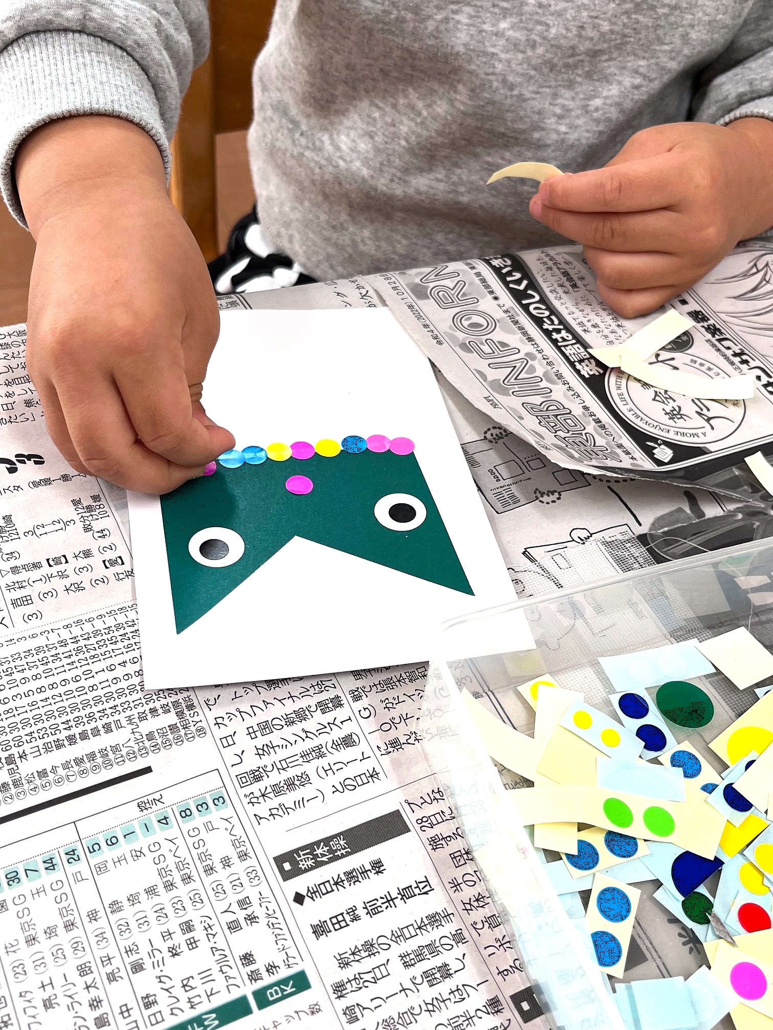あらかじめ描かれたシンプルな形を見て、「これは何に見えるかな?」と自由に想像を膨らませてみましょう。 そこに丸や四角などのパーツをペタペタと貼り足していくと、あなただけのオリジナルイメージが完成します! 好きなものや見え方は人それぞれ。同じ形からどんな個性が飛び出すか、ぜひ体験してみてください。小さな四角に色をつけてブローチも作ります。